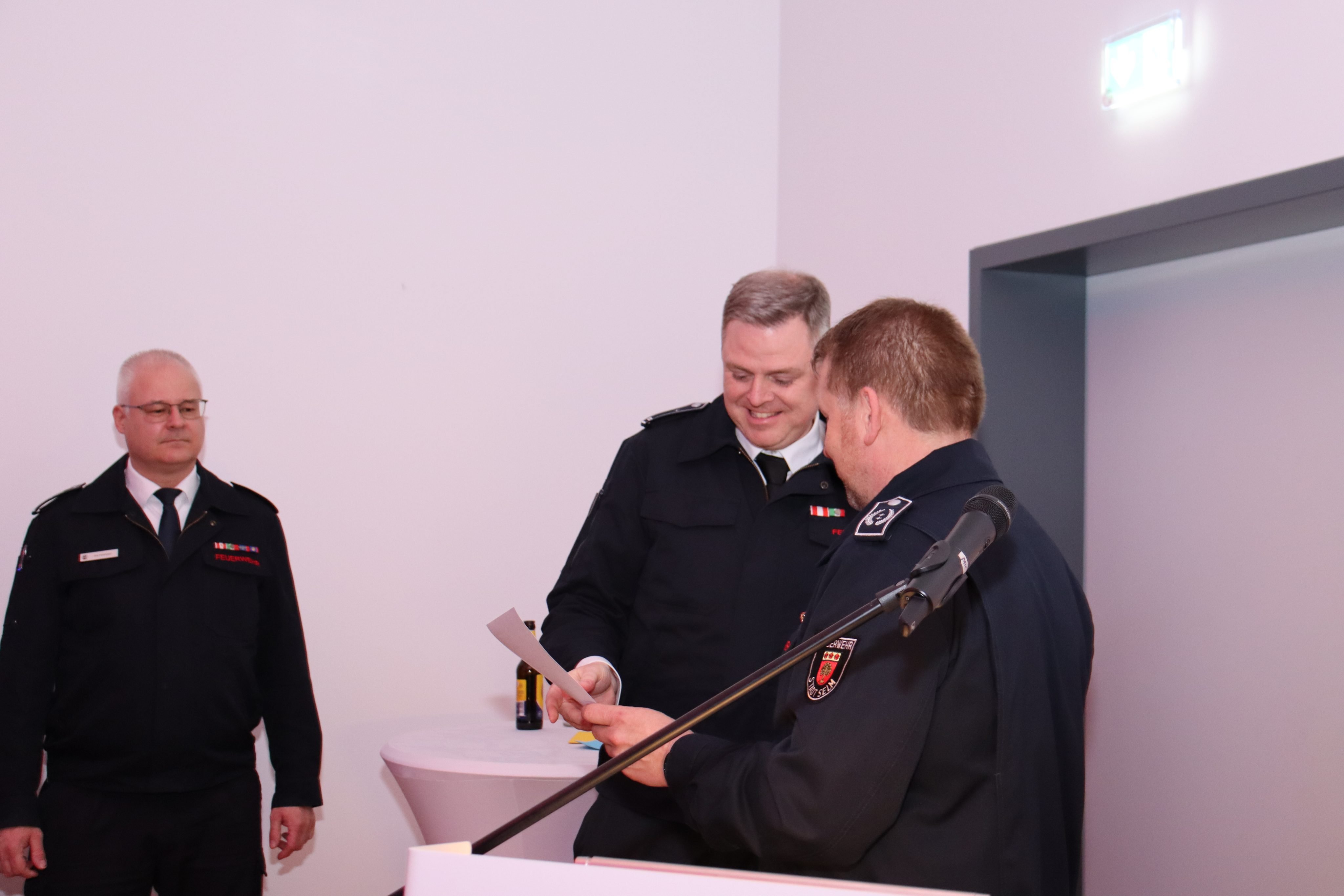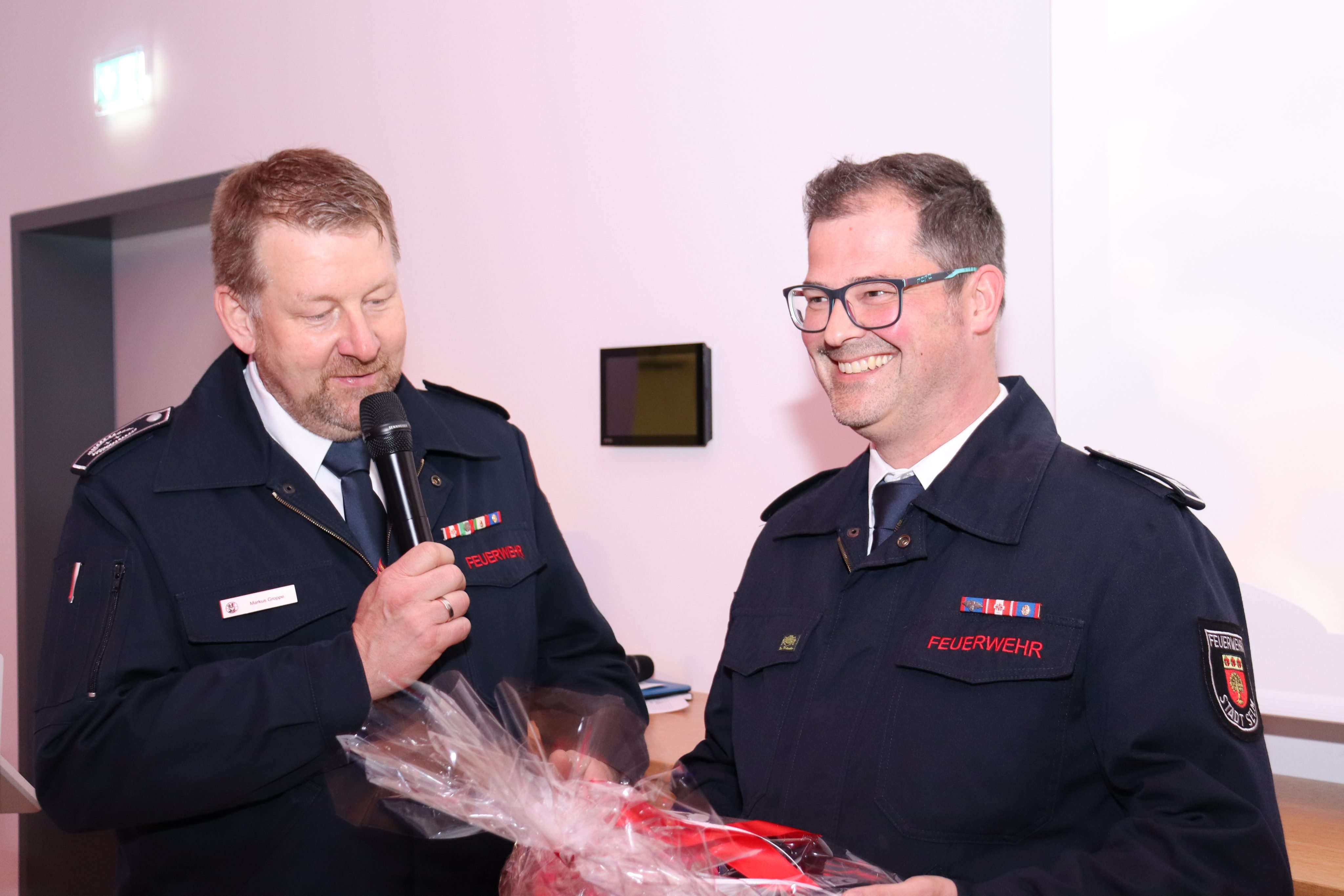 Ein weiterer besonderer Moment des Abends war der Dank an Jörg Paukner und Christian Niehues. Im Namen der gesamten Feuerwehr würdigte Markus Groppe ihren langjährigen Einsatz bei der Durchführung zahlreicher Grundlehrgänge und überreichte ihnen als Zeichen der Anerkennung ein Präsent.